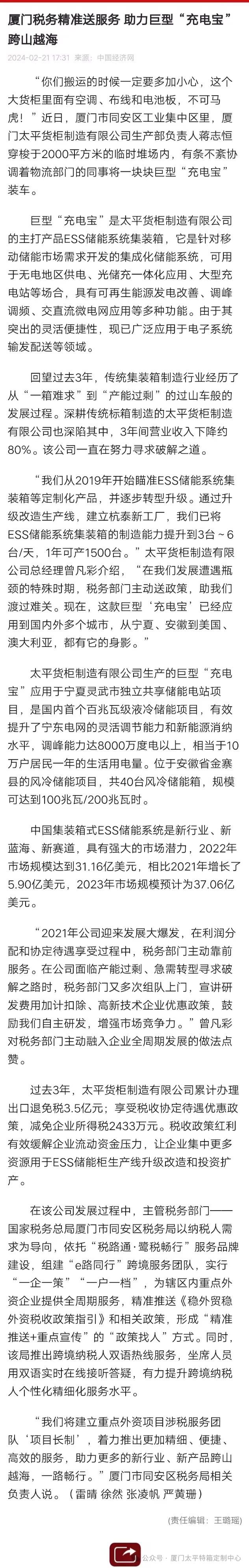 “廈門稅務(wù)精推送服務(wù),助力巨型“充電寶”跨山越?!北恢袊?jīng)濟(jì)網(wǎng)轉(zhuǎn)載
